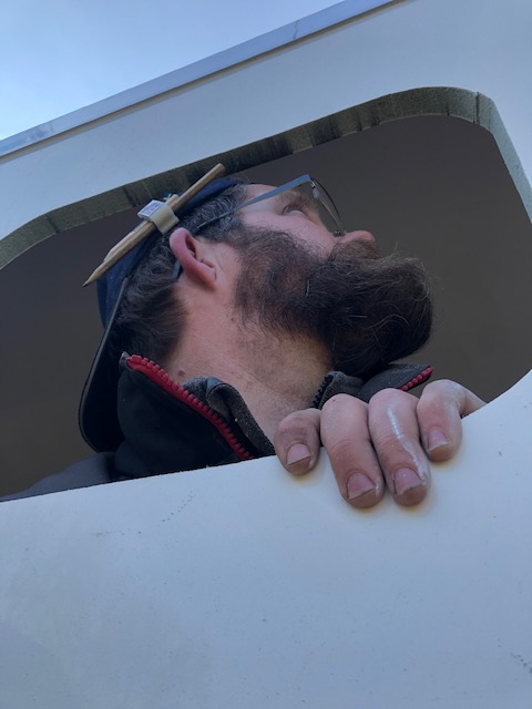 First port of call was to get ready to cut two holes in Hetty’s roof. A daunting task, we set about plotting the exact location of the electric fan that will be above the lounge area. Dave climbed the ladder up the front of Hetty and with the aid of two bits of scaff board for support, he set about measuring and drawing the location for the first cut. Eeek. Then he measured again. Then I roughly measured inside. Then Dave checked the measurements again. Ok, no more putting it off. Let’s get cutting. Well, Dave was cutting. I was being the glamorous assistant (GA) who stood around in garden crocs and my old fleece taking photos and making encouraging noises.