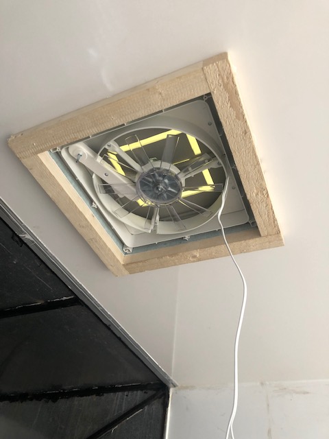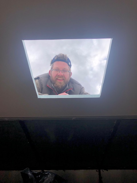 With hole one successfully cut, we set about fitting the fan. After a bit of a false start (it turns out we didn’t need the thicker wooden frame after all) fan one was in! A temporary fix to the electrics spurred us on (see what I did there) as it all worked well. Hoorah. Onto roof hole number two.