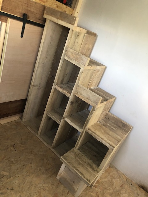 We have built a wall, insulated the bed area, fitted a new external door, fixed loads of batons, fixed a leak, fitted a new internal back door, ordered more wood, and stuff, ordered the shower door and shower tray. The list goes on. But the bestest bit so far, in my opinion, is our stairway to heaven made from old scaffolding boards. I spent many hours lovingly sanding them down. We thought it had nailed it but found it to be alarmingly hazardous to walk up and down, so quickly decided to double the width.